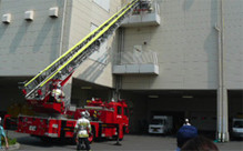 消防署の協力のもと、火災が起きた時を想定し、はしご車を使った消防訓練も行っております。