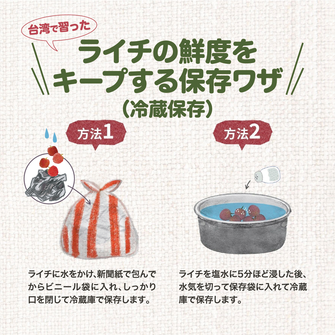 昨年ご好評いただいた《玉荷包(ギョクカホウ)種》に続き、今年は台湾で広く栽培されている最も代表的な品種《黒葉(クロハ)種》をご用意いたしました。黒葉ライチの濃厚な甘みと芳醇な香りは、昔ながらの「懐かしいライチの味」として台湾の人々に長く親しまれてきました。赤みの強い果皮と、透明感のある白い果肉が特徴で、みずみずしくやわらかな食感がお楽しみいただけます。
