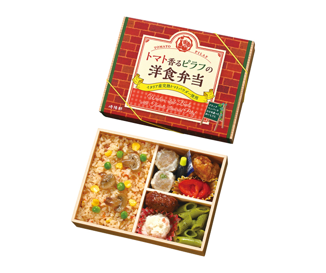A colorful bento featuring tomato pilaf with a balance of sweetness and tang, combined with a selection of classic Western-style dishes.