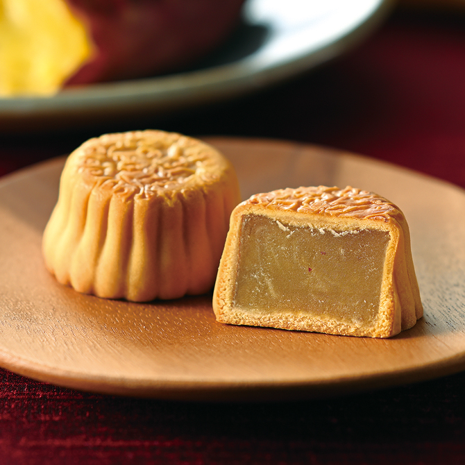 焼き芋のほっくりとした食感と自然なやさしい甘みが楽しめる月餅です。焼き芋あんは、一般的なあんよりも水分の少ない状態までじっくりと炊き上げ、角切りの鳴門金時を練り込みました。鳴門金時の自然な甘さと風味を追求した、この時期にしか味わえない月餅です。