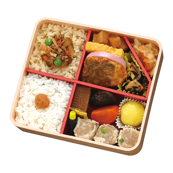 | 内容 | 白飯(トッピング:小田原産梅干)、茶飯(トッピング:牛ごぼう煮)、真鱈の味噌だれ和え、三浦産芽ひじきと蓮根の炒め煮、小田原蒲鉾、昔ながらのシウマイ3個、玉子焼き、筍煮、人参煮、椎茸煮、こんにゃくのピリ辛煮、柚子入り大根漬け、柚子あん入り団子 | ||