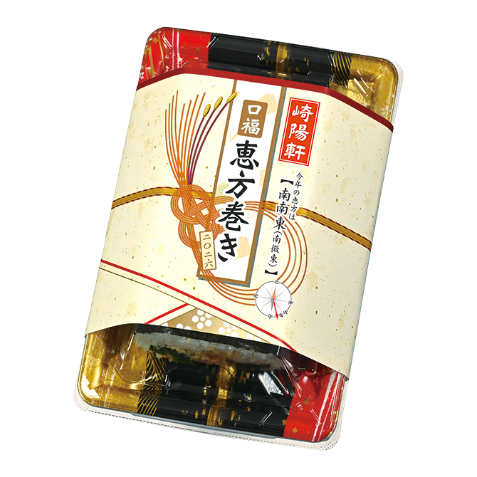 福をもたらすと言われる七福神にあやかって、七種類の具材を使用した恵方巻きです。“おめでたい”にかけた「鯛そぼろ」、彩りと味わいを添える「菜の花」や「カニ風味蒲鉾の甘酢漬け」、崎陽軒ならではの味として人気の筍煮の味付けをもとにした「千切り筍煮」、「玉子焼き」、「生姜昆布和え」といった具材と、「帆立」を混ぜた酢飯を、「かながわブランド」にも名を連ねる地元・神奈川県産海苔の焼き海苔で巻きました。太巻きにかぶりつくと、口の中で具材のおいしさが幾重にもまじり合い、幸福と口福※をもたらします。