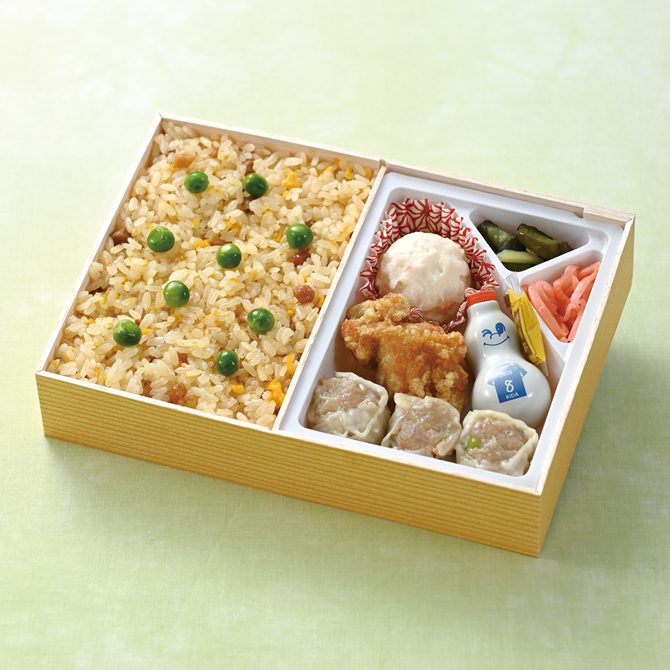 | 内容 | チャーハン(トッピング:グリンピース)、昔ながらのシウマイ 3個、鶏の唐揚げ、ポテトサラダ、千切り生姜、きゅうり漬け、トリコロールひょうちゃん1種 | ||