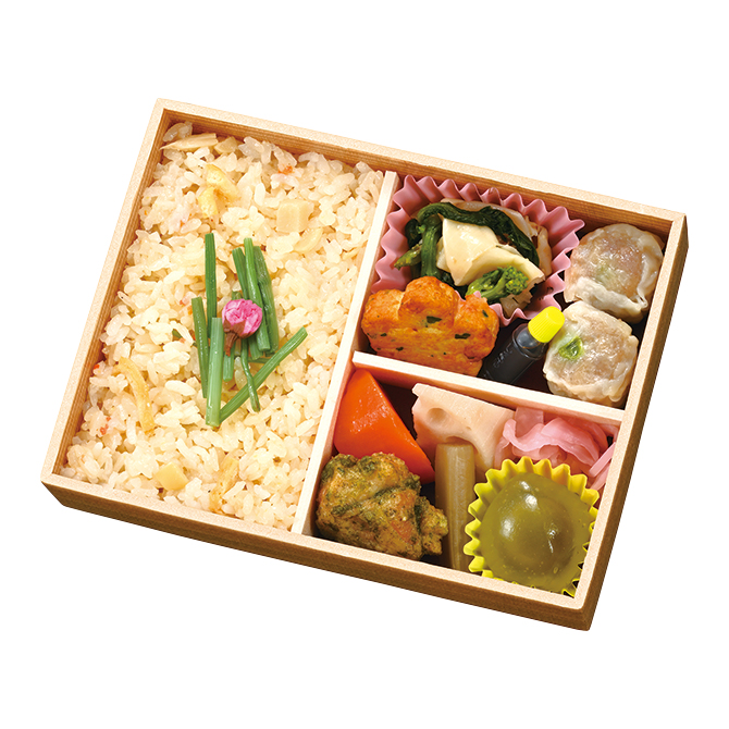 | 内容 | 筍ごはん(トッピング:桜の花の塩漬け、山せり煮)、花型豆腐しんじょの揚げ煮、鶏の青海苔唐揚げ、煮物(ふき煮、人参煮、蓮根煮)、菜の花と筍姫皮のからし和え、昔ながらのシウマイ 2個、大根の桜漬け、抹茶あんの葛まんじゅう | ||